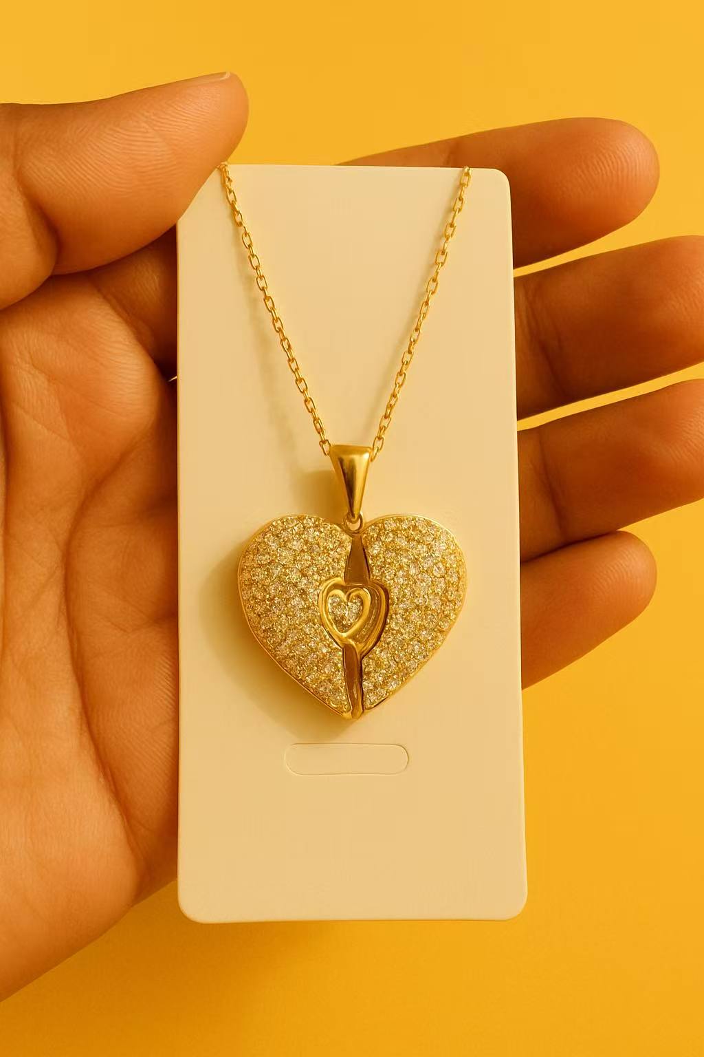 “A premium double-heart pendant featuring a sparkling outer heart with a golden inner heart – symbolizing love, elegance, and togetherness. Perfect for gifting or daily wear.